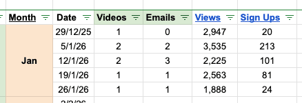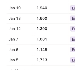The “Videos” and “Emails” column have green headers because I can control them. I can’t control views, but I can control how many videos I post! I fill it out on a Monday morning. And I absolutely love doing it. It makes things feel like a video game. Plus my monkey brain want see big number go bigger. So I have a simple, friendly suggestion for you today. Track your progress. Specifically, track your INPUTS. Do the same thing I do, and every single week track whether you are actually doing the things that take you towards your goal. It's usually pretty shocking how little we're actually doing. Excuse me while I insert an epic adage: “What gets measured gets managed” I want to write more this year, so I’ve started tracking my word count. I know that I can’t improve it if I don’t actually know how much I’m writing. I’m tracking it in Notion. Here’s a snap from Jan: Shock horror, I’m not writing as much as I thought I was. Even just looking at this now I’m like wait…what? I swear I was writing on more days than that? But I wasn’t. And at least I can see that. Data reveals the truth. So whatever you’re trying to achieve right now, whether it’s more views, applications or revenue, track your progress every week. And focus on the inputs that will change your outcome. Make a simple google sheet and start tracking. Tintin 🫡 P.s. If you're serious about building a six figure business from your channel, then you might be interested in The $100k YouTuber. The other thing I do every single week is work closely with YouTubers in the programme to build their business. You can learn more and apply to book a call directly with me on this page here. My YouTube Channel: watch here The $100k YouTuber Roadmap: read here |